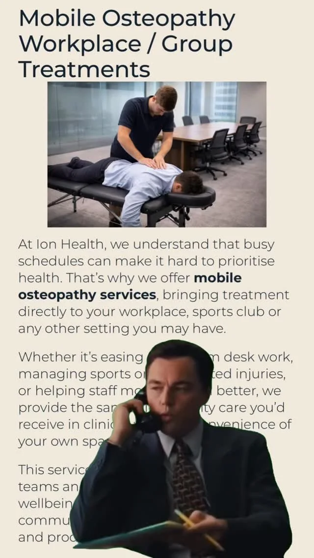 At Ion Health, we use a tailored combination of osteopathic techniques to support your recovery and overall wellbeing. Treatments may include methods such as High-Velocity Low-Amplitude (HVLA) adjustments, Muscle Energy Techniques (MET), and Myofascial Release, alongside adjunctive therapies like dry needling and electrotherapy. We also provide individualised exercise programs, not only to help rehabilitate current injuries, but to reduce the risk of future ones. Your comfort is always a priority, and we take great care in selecting the most appropriate techniques for your condition, ensuring treatment is effective, gentle, and suited to your needs.